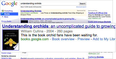 Each Google Books result will display the book’s title and author, a short excerpt containing the highlighted search terms, and other public data about the book.
