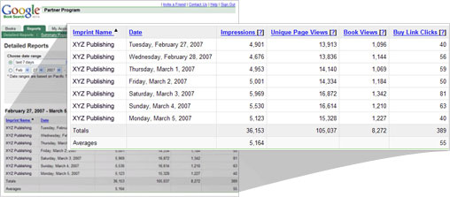 Online reports let you manage your account information, view how many consumers have looked at your titles, see click rates on purchase links, and review other stats related to the Google Books program.